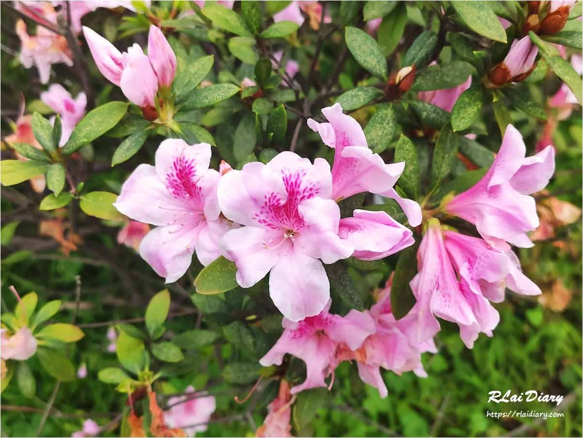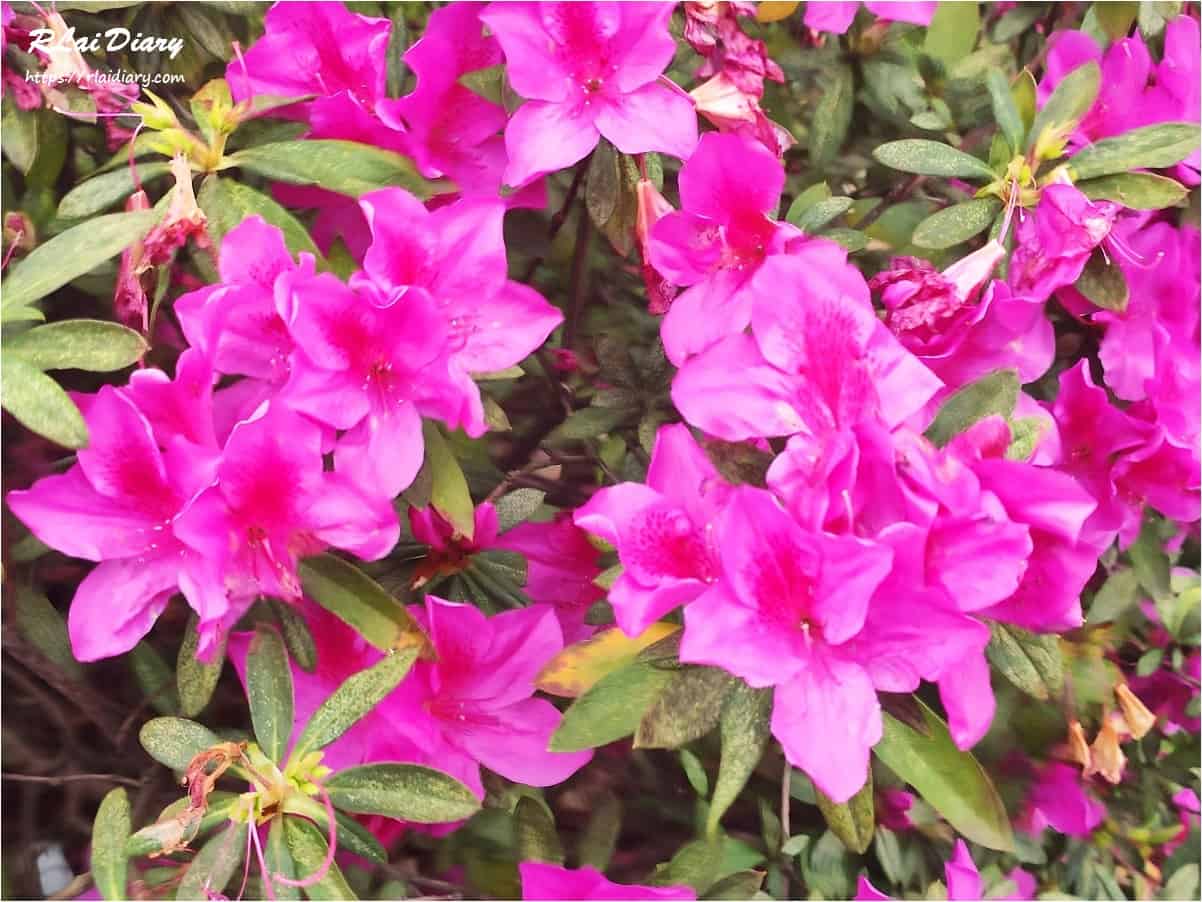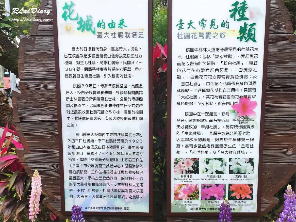 2020/03/18玩遍台灣【台北 ※ 玩】賞花|臺大杜鵑花節臺大杜鵑花節,校園裡盛開綻放了各式花朵 分享這篇文章 地址:台北市大安區羅斯福路四段1號花況拍攝日期:2020.03.17 追蹤我的 Instagram 追蹤我的 臉書粉絲團 內容目錄 Toggle 臺大杜鵑花節 介紹心得 臺大杜鵑花節 介紹 每年三月臺大校園裡盛開的杜鵑花總是綻放得清新脫俗令人難以忘懷也讓臺大贏得了杜鵑花城的美譽 從校門口進入沒多久就可以看到臺大的花城歷史以及臺大常見的杜鵑花種類介紹看板下方的植物也非常的吸睛特地上網查了一下原來叫做「羽扇豆」 再走幾步看到的「台東鐵蘇」造型也很特別 經常在電視上看到的「椰林大道」因為當天時間有限所以拍攝的杜鵑花主要都以椰林大道兩旁為主 臺大杜鵑花節 花況 拍攝當天花況相當不錯隨手一拍都很漂亮 白琉球杜鵑 白琉球杜鵑花冠漏斗形,花瓣五枚白色,喉部帶青黃色花期 2 到 4 月 豔紫杜鵑 艷紫杜鵑花冠漏斗形花色呈艷紫色花心有紅色斑點花期 2 到 4 月 粉白杜鵑 粉白杜鵑又稱粉紅杜鵑花色粉紅帶有紅色斑點花瓣五枚花期 2 到 4 月 偶爾也會看到一些不同品種的杜鵑生長在一起不知道是不是嫁接的技術 … ? 心得 校園內能看到青春洋溢的學生們搭配椰林大道兩旁盛開的各種顏色杜鵑花處處是景點加上周邊的公館商圈美食美景與美食都兼顧 延伸閱讀 – 周邊美食【台北 – 食】中正區 │ 藍家割包 【台北 – 玩】賞花 │ 臺大杜鵑花節 地址:台北市大安區羅斯福路四段1號花況拍攝日期:2020.03.17 分享這篇文章 標籤# 中正區景點# 台北市景點# 花季# 賞花 上一 文章 【台中 ※ 玩】帝國製糖廠台中營業所 下一 文章 【台北 ※ 宿】德立莊酒店 MIDTOWN