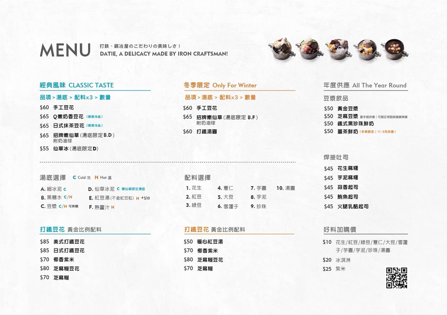 2020/10/10台中美食【台中 – 食】西屯區 │ 打鐵豆花 河南店豆花口感綿密,配料、湯底自由配,搭配特色機器人造型便當盒超療癒 分享這篇文章 地址:台中市西屯區河南路二段320號電話:04-2707-5559連結:打鐵豆花河南店臉書營業時間:11:00 – 23:00 追蹤我的 Instagram 追蹤我的 臉書粉絲團 內容目錄 Toggle 打鐵豆花 河南店 介紹打鐵豆花 河南店 菜單打鐵豆花 河南店 餐點平均花費與心得 打鐵豆花 河南店 介紹 打鐵豆花的老板是原本從事「打鐵業」的鐵人在手工打鐵的過程中不但需要忍耐高溫並要隨時注意火候許多步驟得憑經驗、靠手工才能完成這些特點,如今都成了「打鐵豆花」不可或缺的美味關鍵 這幾年打鐵豆花在台中陸續開了幾間分店此次造訪的河南店招牌算是蠻大的 搭配上門口可愛的打鐵機器人經過時還蠻讓人想走進去吃碗豆花的 打鐵豆花的特色容器「機器人便當盒」看起來超可愛的讓人有種療癒感P.S 店家並不對外販售便當盒 打鐵豆花 河南店 菜單 豆花的湯底和配料都能自由配光是湯底就有 6 種選擇配料選擇更是多達 9 種除了基本的任選 3 項配料外也有好料加價購想吃哪些配料都可以選好選滿另外除了甜湯外也有販售焊接吐司能夠解解饞 打鐵豆花 河南店 餐點 手工豆花 - 黑糖水湯底 │ 60 元 奇怪 … 豆花怎麼沒有給配料 ?原來是被豆花給蓋住了 這碗豆花的湯底選擇黑糖水配料部分則是大豆、珍珠和湯圓豆花的口感綿密一入口就感覺到實實在在的豆香黑糖水的微甜讓人不會有負擔大豆用心煮到軟爛珍珠也保留了彈性湯圓則是讓我最驚豔的口感比預期還 Q 彈好幾倍 手工豆花 - 細冰泥湯底 │ 60 元 這碗豆花的湯底選擇細冰泥配料部分則是花生、紅豆和芋圓因為碗底有細冰泥和豆花的關係讓配料往上堆疊滿滿好料看來超豐盛 花生和紅豆用心熬煮口感不會過爛吃的出顆粒口感芋圓也很可以除了 Q 度外還吃的到芋頭香氣 追蹤我的 Instagram 追蹤我的 臉書粉絲團 平均花費與心得 此次平均花費金額:60 元 / 人打鐵豆花的雖然在訂價上比一般的傳統豆花高了些但食材品質有一定水準湯底和配料選擇自由度高搭配可愛的機器人便當盒容器每次來都有種療癒感總是還是會讓人想再來吃啊 延伸閱讀 – 周邊美食【台中 – 食】西屯區 │ 雋永邨 河南店【台中 – 食】西屯區 │ 銅鑼灣文記港式餐廳 【台中 – 食】西屯區 │ 打鐵豆花 河南店 地址:台中市西屯區河南路二段320號電話:04-2707-5559連結:打鐵豆花河南店臉書營業時間:11:00 – 23:00 分享這篇文章 運彩出金 戰神賽特 咖啡豆挑選 冰萃秘訣 企業禮盒 球隊戰力觀察 標籤# 台中西屯區美食 上一 文章 【台中 – 食】北屯區 │ 慢。丼作 下一 文章 【台中 – 食】清水區 │ 正牌米糕莊