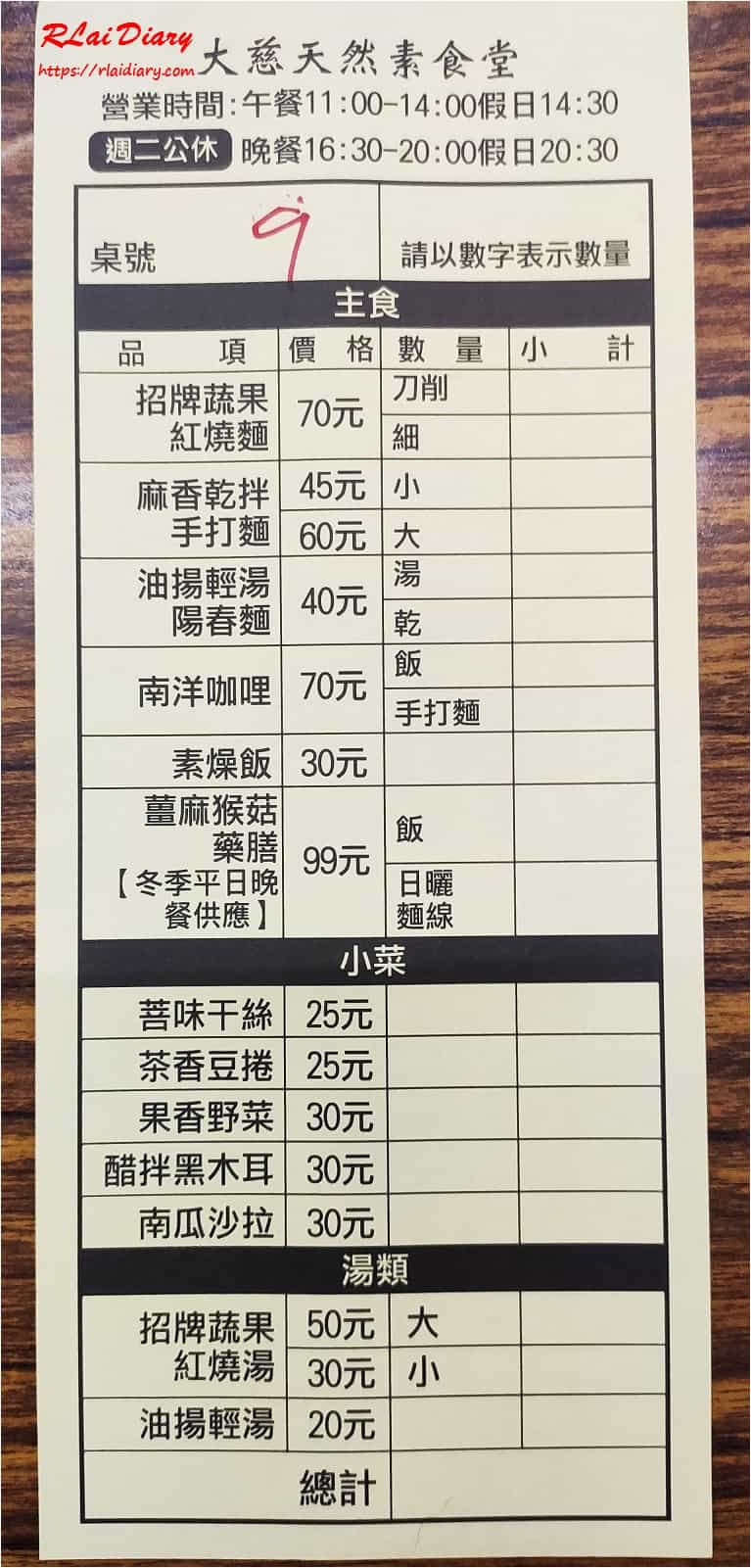 2020/02/18台中美食【台中 ※ 食】北屯區|大慈天然素食堂素食餐點的好選擇,食材天然調味健康,麵條 Q 彈,推薦招牌蔬果紅燒麵必點 分享這篇文章 地址:台中市北屯區東山路一段328號電話:04-2437-5595連結:大慈天然素食堂臉書營業時間:週二公休午餐:11:00 – 14:00 假日到 14:30晚餐:16:30 – 20:00 假日到 20:30 近幾年來,健康養生的風氣逐漸抬頭所以素食和蔬食類的餐飲感覺也比以往多了不少位在住家附近的大慈素食也成了經常光顧的選擇 如果是第這一次來用餐可能要注意一下因為店內也兼販有機食品與自釀的有機醋等所以只有側面的招牌有寫到大慈天然素食堂正面的招牌則是大大的張家醋 追蹤我的 Instagram 追蹤我的 臉書粉絲團 大慈天然素食 菜單 大慈素食的餐點相當的平價店內也有提供醋飲可以免費飲用菜單上只有一點要注意一下薑麻猴菇藥膳是冬季平日晚餐限定 小菜 – 果香野菜 │ 30元 野菜裡還加上了水果的醬汁果香的味道有點像百香果又有點像柳橙 … ?吃來酸酸甜甜的很開胃 小菜 – 醋拌黑木耳 │ 30 元 除了 Q 軟的黑木耳外也有一些爽脆的小黃瓜也是一道酸甜開胃的小菜 小菜 – 南瓜沙拉 │ 30 元 基底是由馬鈴薯丁加上由南瓜泥調的沙拉再加上小黃瓜丁增添口感感覺比起一般加了很多美乃滋的沙拉健康許多 招牌蔬果紅燒刀削麵 │ 70 元 照片上的小菜是茶香豆捲只要是點招牌蔬果紅燒麵都會附贈喔 … !!!但是份量會比小菜單點少一點 這碗招牌蔬果紅燒麵真的是每次來用餐必點 … 大推薦給料非常大氣除了煮到軟嫩的大塊紅蘿蔔和白蘿蔔還有青菜以及素料等 刀削麵口感也很好 Q 彈 Q 彈雖然說是紅燒口味,但以蔬果為基底的湯湯頭有自然的甘甜味,會讓人想把湯給喝完 麻香乾拌手打麵 │ 45 元 麵條雖然不是刀削的但手打麵的 Q 度也很讓人滿意麻醬的味道香濃醬汁也給的很夠同樣是店內的人氣餐點 南洋咖哩飯 │ 70 元 拍照時突然覺得店家擺盤還蠻用心的 … 哈哈 咖哩醬汁並不算濃稠其實有一點像湯的感覺應該也是有蔬果基底吃來帶有甜味,算是清爽口味的咖哩 平均花費與心得此次平均花費金額:NT 82 元 / 人 大慈素食的價位都很親民食材也走天然取向 餐點口味上大多有蔬果基底所以會稍微帶一點甜味感覺是一間用心經營的店家 若是有建議和評論店家也都會認真回覆與改善 延伸閱讀 – 周邊美食【台中 – 食】Red Garden 紅花園複合式餐飲店【台中 – 食】 馬岡豆花 – 東山店【台中 – 食】 軍功無名蛋餅早餐店【台中 – 食】 軍功水煎包【台中 – 食】 軍功 – 潤餅刈包之家 地址:台中市北屯區東山路一段328號電話:04-2437-5595連結:大慈天然素食堂臉書營業時間:週二公休午餐:11:00 – 14:00 假日到 14:30晚餐:16:30 – 20:00 假日到 20:30 分享這篇文章 運彩出金 戰神賽特 咖啡豆挑選 冰萃秘訣 企業禮盒 球隊戰力觀察 標籤# 紅燒# 素食# 麻醬 上一 文章 【台中 ※ 食】東區|高麗屋 韓式餐廳 下一 文章 【台中 ※ 食】北區|巨人傳統早餐