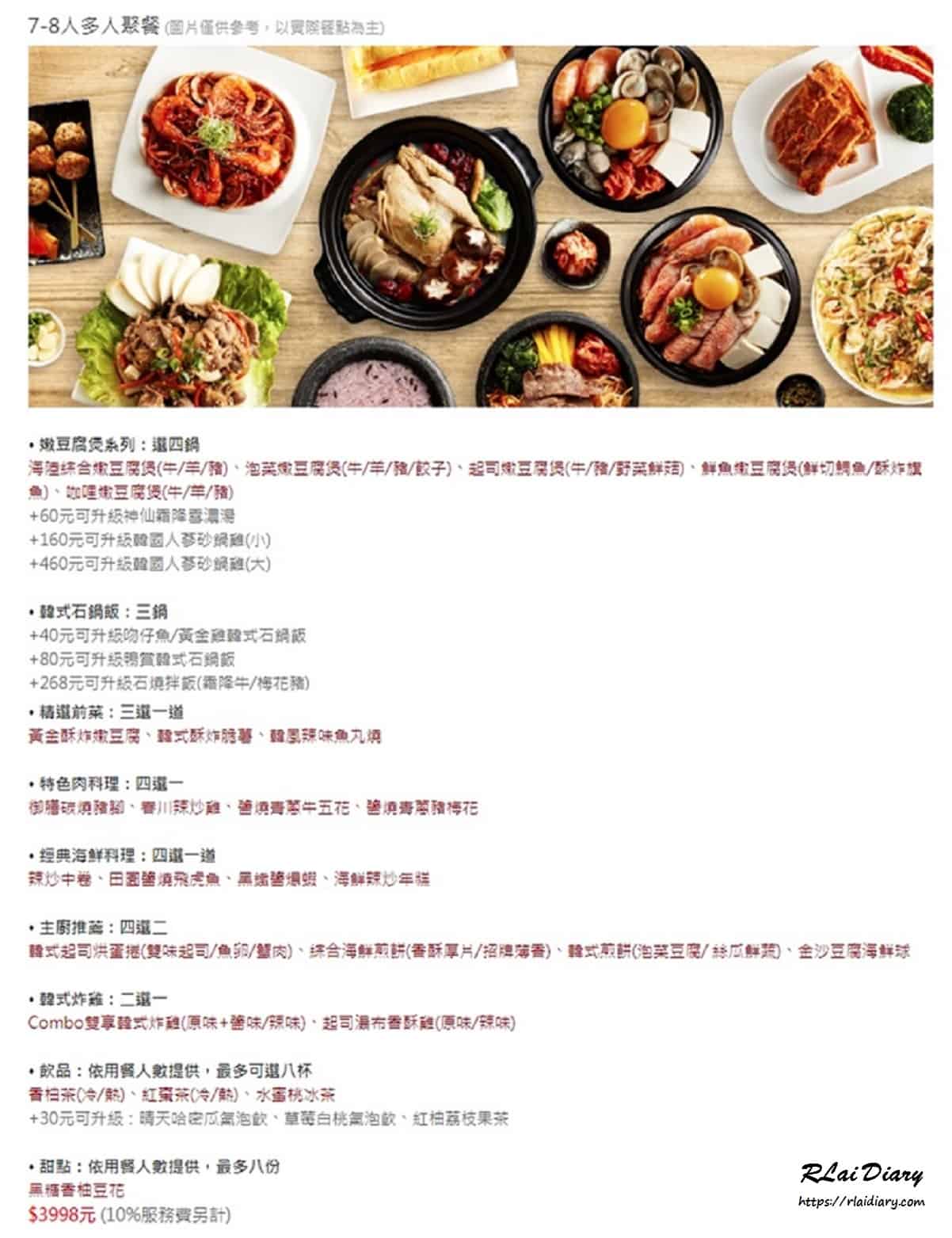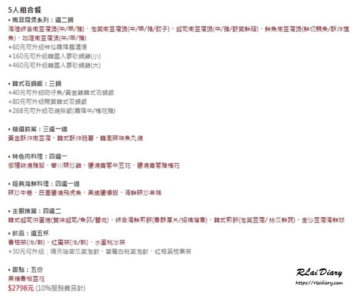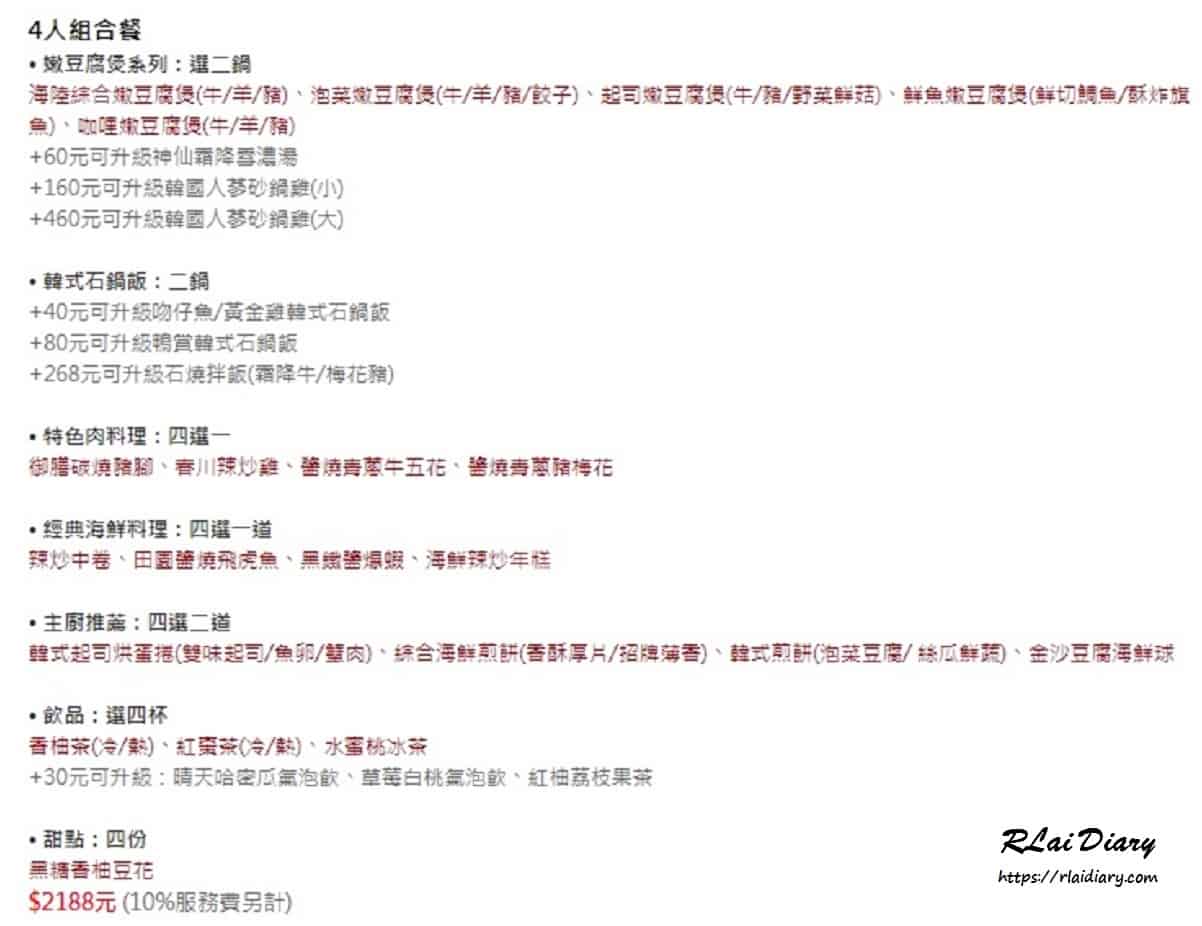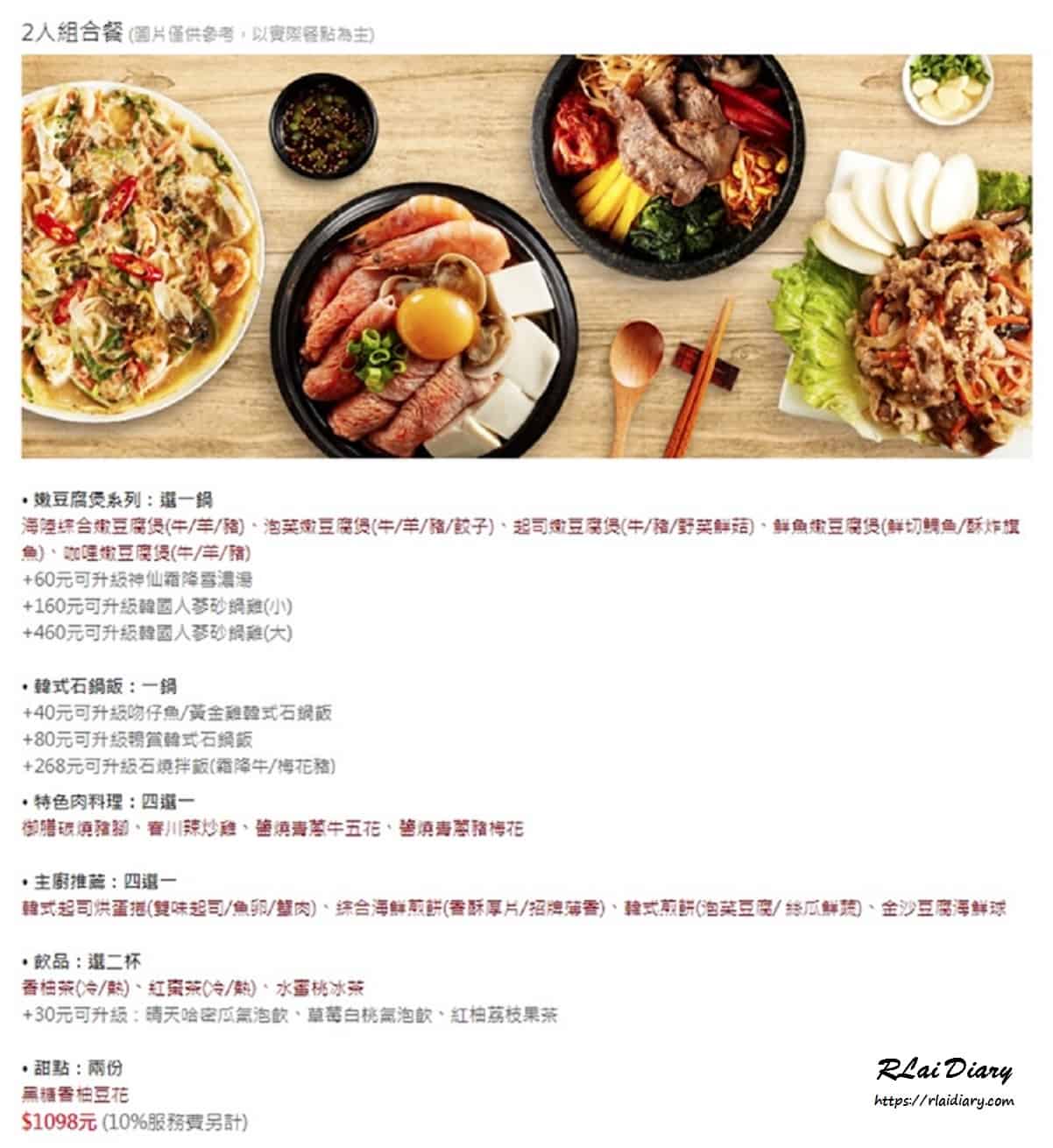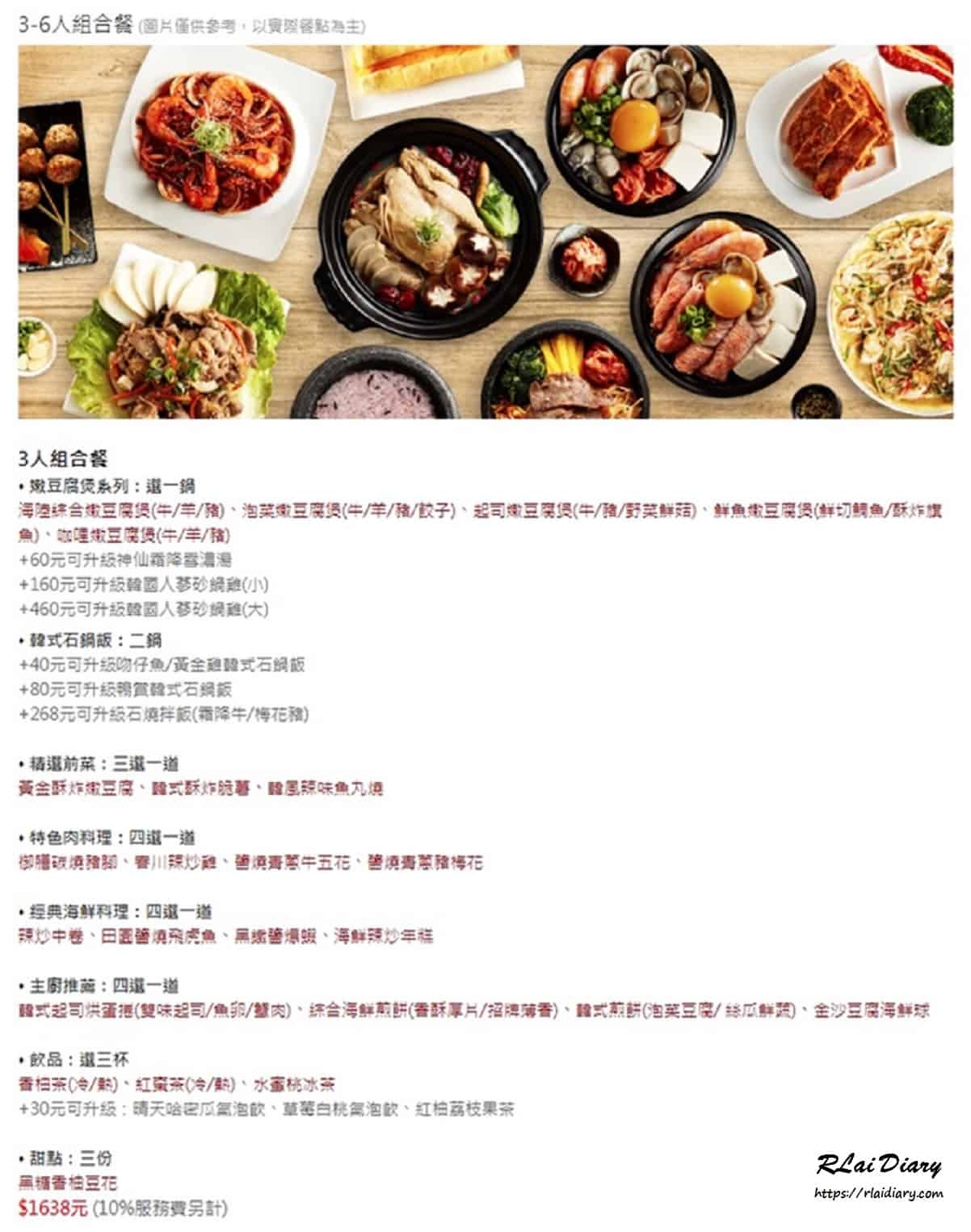 2020/05/02台中美食【台中 ※ 食】后里區|涓豆腐 台中麗寶店麗寶 Outlet 美食,精緻韓式料理品牌,小菜無限吃到飽 分享這篇文章 地址:台中市后里區福容路201號1樓電話:04-2557-0766連結:涓豆腐官網、涓豆腐麗寶店臉書營業時間:週一至週五 11:30 – 15:00 │ 17:30 – 21:30星期六、日 11:00 – 21:30 追蹤我的 Instagram 追蹤我的 臉書粉絲團 內容目錄 Toggle 涓豆腐 台中麗寶店 介紹涓豆腐 台中麗寶店 菜單涓豆腐 台中麗寶店 餐點平均花費與心得 涓豆腐 台中麗寶店 介紹 趁著休假跑到台中麗寶 Outlet 敗家在還沒失控把錢花光前決定先在 Outlet 裡找東西吃剛好看到 1 樓的涓豆腐想一想好像有一陣子沒有吃韓國料理了就決定候位入場啦 當下正值用餐時間所以店內是客滿的向櫃台人員登記用餐人數並留下聯絡資訊後可以繼續在 Outlet 內逛逛等到有位子時會電話通知屆時再回來用餐即可 麗寶店內部算蠻寬敞的但用餐時段還是經常一位難求 … 涓豆腐 台中麗寶店 菜單 因為菜單的照片有點多為了文章閱讀方便先放上較划算的多人套餐部分單點菜單則放在文末 2 人組合餐 3 人組合餐 4 人組合餐 5 人組合餐 7-8 人多人聚餐 涓豆腐 台中麗寶店 餐點 當天總共是 3 個人用餐但其實並不太會餓所以只有點了一份 2 人組合餐份量其實還蠻夠的 總共 5 種小菜菜色應該沒有固定但味道都不錯重點是小菜部分可以無限免費續點 !!!有時候吃韓國料理都會自己把小菜丟到石鍋飯裡加菜 … XD 春川辣炒雞 - 2 人組合餐內容 │ 1098 元 除了高麗菜之外重點是去骨雞腿肉和韓式年糕料理的很入味食材都有吸附韓式辣醬是一道有辣度的下飯料理 綜合海鮮煎餅 - 2 人組合餐內容 │ 1098 元 這道海鮮煎餅有 │香酥厚片│招牌薄香│ 2 種口感可以選擇當天選擇的是厚片類型煎餅的內餡很豐富每一口都吃的到海鮮咬下去有焦脆的聲音不沾醬單吃就好吃搭配沾醬後又會有另一種風味 黃金雞韓式石鍋飯 - 2 人組合餐內容 │ 1098 元 加價 40 元升級 加價 40 元石鍋飯上鋪滿雞肉跟香菇感覺非常划算 … !!!石鍋飯上桌後先稍等一下再攪拌可以吃到比較多的鍋巴也可以拿小菜的海苔包上其他小菜跟石鍋飯一起享用 神仙霜降雪濃湯飯 - 2 人組合餐內容 │ 1098 元 加價 60 元升級 這道神仙霜降雪濃湯是涓豆腐的桌邊料理工作人員會端上石鍋後 先加入洋蔥拌炒一小段時間再放入黃豆芽一起拌炒接著放入牛肉再倒入乳白色湯頭後大功告成湯頭是使用大量牛骨、牛膝骨、牛肉等各種部位持續使用大火熬煮喝起來挺濃郁算是另類的牛肉湯 … ? 熱香柚茶 & 熱紅棗茶 - 2 人組合餐內容 │ 1098 元 飲品的部分就挺中規中矩沒有特別的記憶點 … 黑糖香柚豆花 - 2 人組合餐內容 │ 1098 元 豆花淋上黑糖還有柚子醬香甜黑糖和柚子味道搭配的新奇口味 這裡要感謝一下涓豆腐的工作人員正常的 2 人組合餐是只有 2 份豆花的但我們其實是 3 個人來用餐所以工作人員直接送三份豆花給我們 … 感謝 追蹤我的 Instagram 追蹤我的 臉書粉絲團 平均花費與心得 此次平均花費金額:NT 400 元 / 人 ( 未包含 10 % 服務費 )每一道餐點的份量其實還不少小菜可以免費續整體吃完也有飽足感店內環境和服務都不錯料理口味也都有一定水準雖然算是中高價位但仍是值得推薦的一間韓國料理 涓豆腐 台中麗寶店 單點菜單 單點菜單 – 宮廷饗宴 單點菜單 – 韓式嫩豆腐煲系列 單點菜單 – 韓式石鍋飯系列 單點菜單 – 兒童專屬 單點菜單 – 精選前菜 單點菜單 – 特色料理 單點菜單 – 主廚推薦 單點菜單 – 飲品 【台中 – 食】后里區 │ 涓豆腐 台中麗寶店地址:台中市后里區福容路201號1樓電話:04-2557-0766連結:涓豆腐官網、涓豆腐麗寶店臉書營業時間:週一至週五 11:30 – 15:00 │ 17:30 – 21:30星期六、日 11:00 – 21:30 分享這篇文章 運彩 賽特 咖啡豆推薦 咖啡知識 禮盒推薦 世界盃預測 標籤# 台中后里區美食# 豆府餐飲集團# 麗寶 OUTLET MALL# 麗寶美食 上一 文章 【台中 ※ 食】西區|小鴨片 下一 文章 【台中 ※ 食】北屯區|厝秘 - 功夫菜‧手路湯