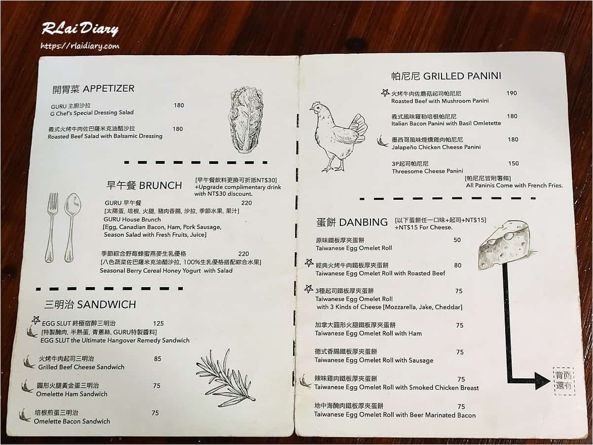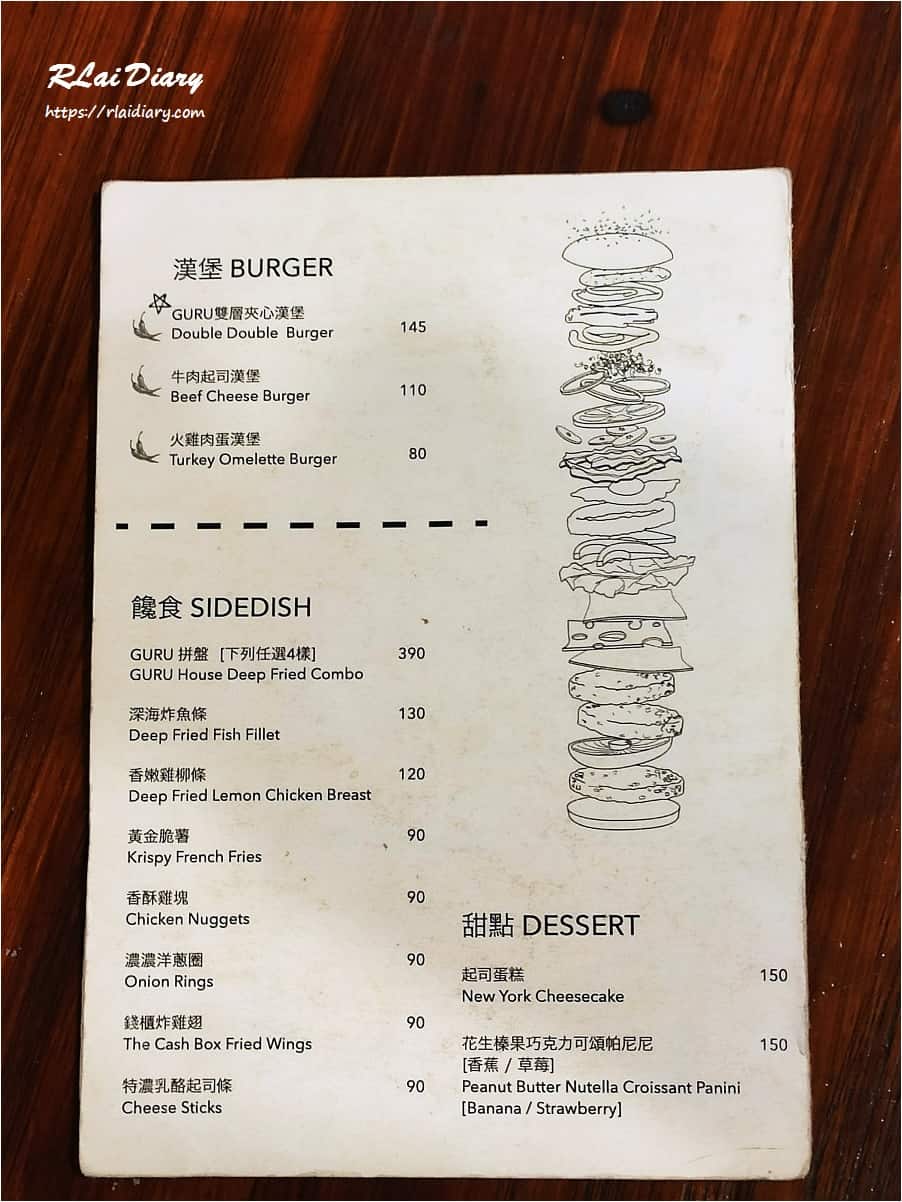 2020/05/16台北美食【台北 ※ 食】萬華區|Guru House 西門店Guru House 西門町餐酒館,人氣香酥鐵鍋蛋餅 分享這篇文章 地址:台北市萬華區成都路27巷10號捷運:西門站6號出口步行約4分鐘電話:02-2361-2522聯結:GURU HOUSE 西門店臉書營業時間:店家因新冠肺炎營業時間調整如下週一公休週二-週四:11:30-24:00週五:11:30-01:00週六:09:00-01:00週日:09:00-24:00 前一陣子在晚餐時段突然想吃蛋餅Google 了一下西門町附近大多數的店家好像都只有賣到中午最後終於找到了這間 GURU HOUSE 嚴格來說 GURU HOUSE 比較像是小酒館這點應該從店裡的裝潢就感覺的出來了 店門口的騎樓下則是提供高腳椅的座位區可以看個人喜好選擇座位 追蹤我的 Instagram 追蹤我的 臉書粉絲團 Guru House - 西門店 菜單 這裡要先注意一點Guru House 店內規定低消為一杯飲品重點是「餐點不算」意思就是每個人都要點飲品 … 以下菜單為酒類 P.S 開車不喝酒,未成年請勿飲酒 3 種起司鐵板厚夾蛋餅 │ 75 元 蛋餅裡包了 3 種起司分別是馬茲瑞拉、傑克與切達起司拍照的時候看著起司融化慢慢流下來的樣子感覺就很好吃啊蛋餅的餅皮算是厚實的口感酥脆不油膩其實有點像蔥油餅的感覺因為起司給的份量不少吃到後來如果有一點膩也可以沾一些帶有辣度的沾醬會有另一種風味 GURU雙層夾心漢堡 │ 145 元 麵包外皮吃起來有一點脆的口感漢堡裡有 2 層厚實的手打牛肉排加上起司與特製美乃滋3 種食材混合在一起非常搭大口咬下後還蠻過癮的 紅茶拿鐵 │ 70 元 紅茶的茶香與奶香味搭配喝起來很順口而且也是店內較親民的低消飲品選擇 抹茶拿鐵 │ 95 元 喝得到抹茶的香味搭配一點甜味也是不錯的飲品選擇 平均花費與心得 此次平均花費金額: 193 元 / 人 GURU House 的餐點個人覺得都還不錯餐點價位若是以小酒館的定位來看也算不貴 只是低消限制每人都要一杯飲品如果可以拿掉這一點應該會更好 … XD 延伸閱讀 – 周邊美食【台北 – 食】艾叻沙 – 西門町創始店【台北 – 食】TimeOut – 西門店【台北 – 食】師園鹽酥雞 – 西門店【台北 – 食】浩克健身早餐 – 西門町紅樓店【台北 – 食】大茶飯 【台北 – 食】Guru House – 西門店地址:台北市萬華區成都路27巷10號捷運:西門站6號出口步行約4分鐘電話:02-2361-2522聯結:GURU HOUSE 西門店臉書營業時間:店家因新冠肺炎營業時間調整如下週一公休週二-週四:11:30-24:00週五:11:30-01:00週六:09:00-01:00週日:09:00-24:00 分享這篇文章 標籤# 蛋餅# 起司# 酒館 上一 文章 【台北 ※ 食】萬華區|大茶飯 下一 文章 【台北 ※ 食】萬華區|媽咪雞蛋仔 西門町