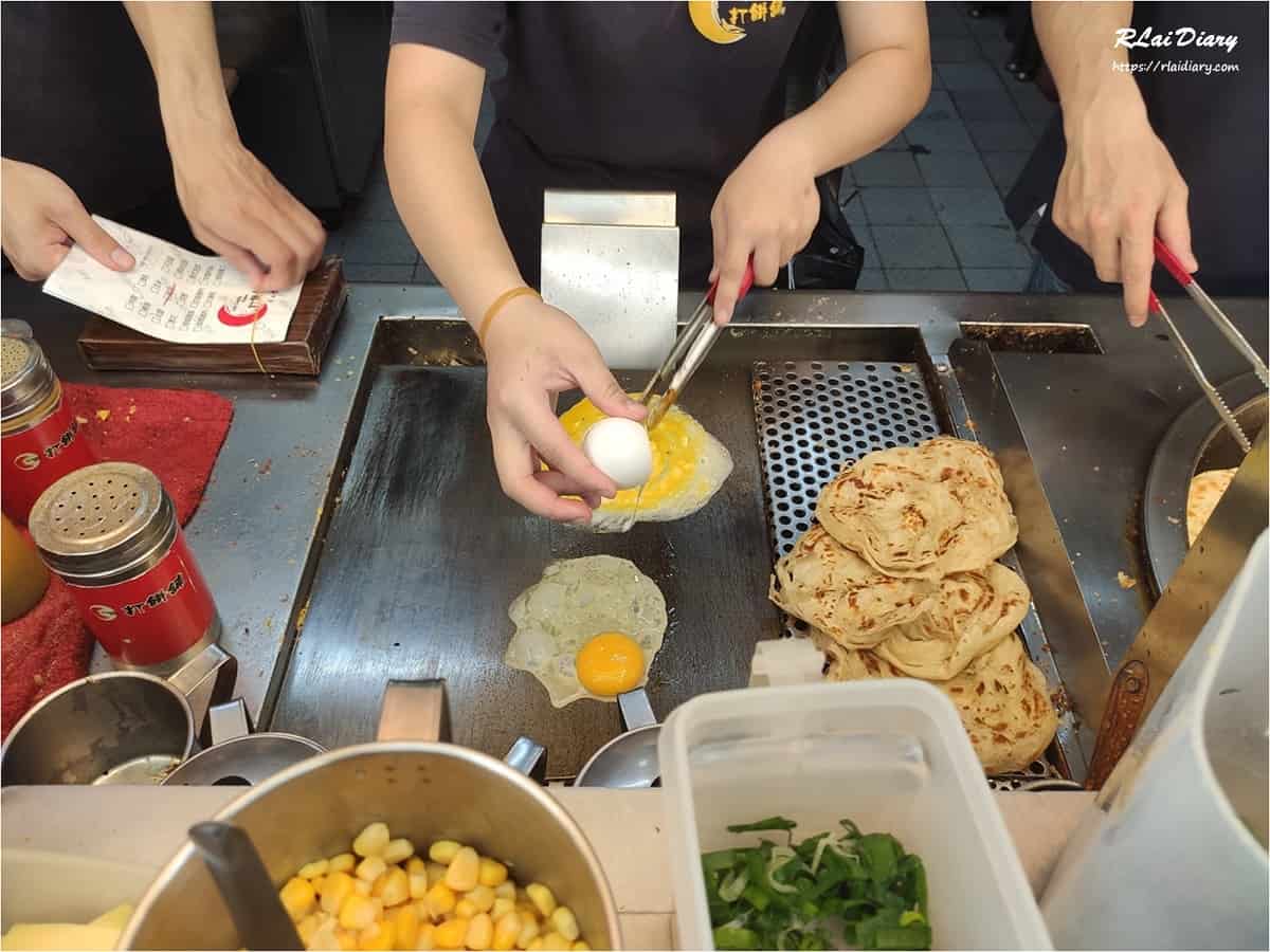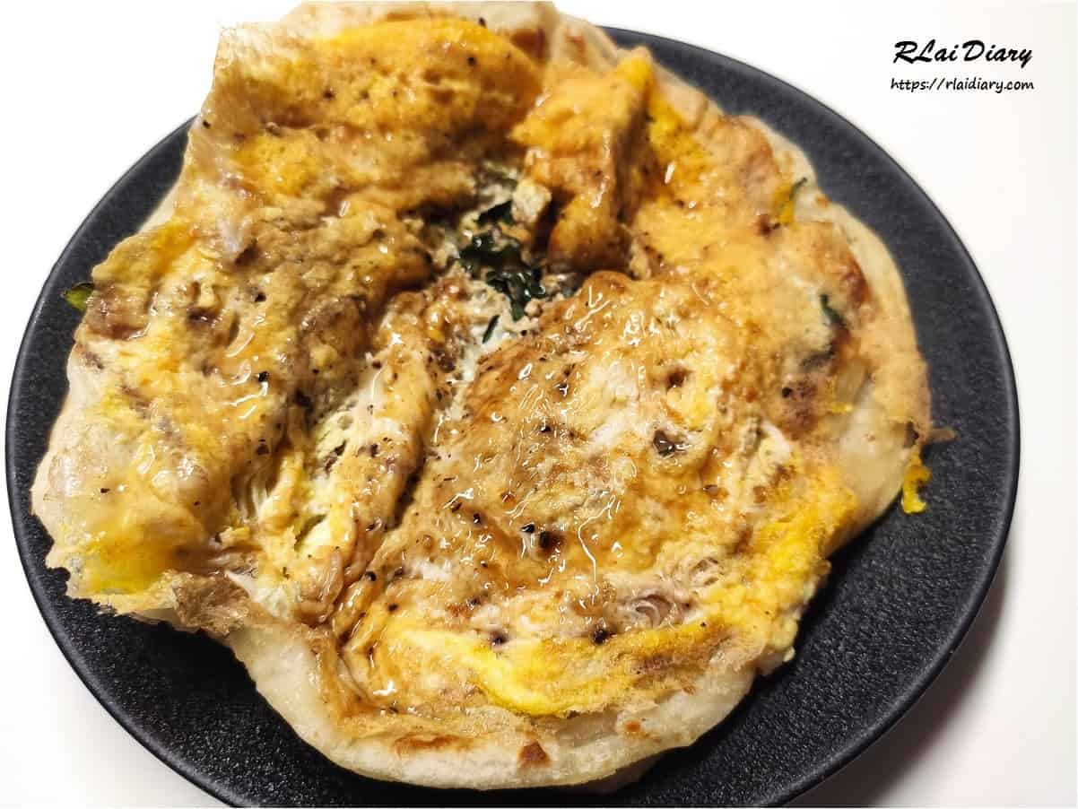 煎到適中的蛋在中間將烙餅和九層塔融合在一起