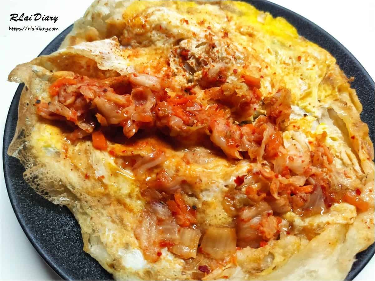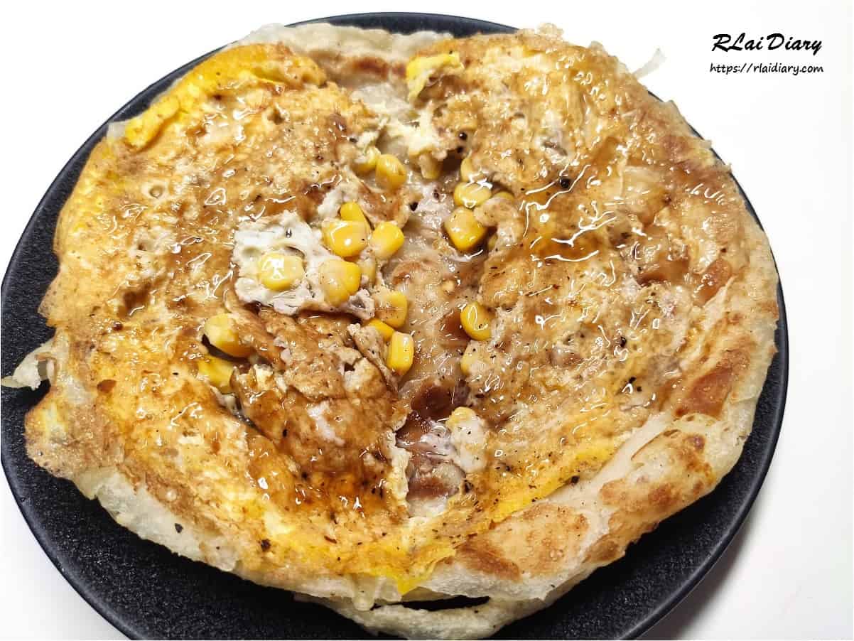 刷在內層的醬汁和烙餅、蛋、玉米結合在一起