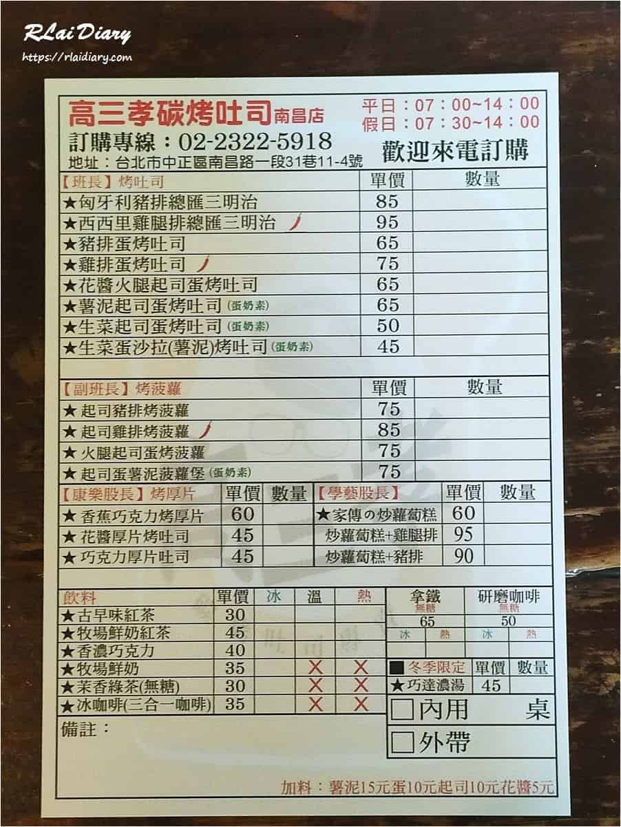 2020/05/03台北美食【台北 ※ 食】中正區|高三孝碳烤吐司 南昌總店懷舊教室風格早餐店,主打碳烤吐司與特色菠蘿堡,高大牧場鮮奶 分享這篇文章 地址:台北市中正區南昌路一段31巷11-4號捷運:中正紀念堂站2號出口,步行約2分鐘即可抵達電話:02-2322-5918聯結:高三孝碳烤吐司-南昌總店臉書營業時間:週一至週五 07:00 – 14:00 星期六、日 07:30 – 14:00 高三孝碳烤吐司主打以課桌椅、黑板組成的用餐環境讓人彷彿回到學生時代教室的感受加上近幾年碳烤吐司愈來愈流行下打開了知名度 店外的招牌稍微被植栽擋住一些看起來並不明顯 南昌總店的空間不大店內與店外的桌椅都是以課桌椅組成 牆上的黑板簡單的介紹了主打的餐點以及強調店內使用的食材來源及特色 追蹤我的 Instagram 追蹤我的 臉書粉絲團 高三孝碳烤吐司 菜單 餐點種類不算多最主要的是【班長】系列的烤吐司以及【副班長】系列的烤菠蘿 起司豬排烤菠蘿 │ 75 元 用菠蘿堡取代傳統的漢堡烤過的菠蘿口感外酥內軟又帶有一點甜味搭配起司與豬排內餡鹹鹹甜甜的組合相當不錯意外的好吃 !!! 店內有提供免洗塑膠手套可以輕鬆享用餐點不用擔心沾手 西西里雞腿排總匯三明治 │ 95 元 招牌的碳烤吐司吐司在碳烤後有獨特的香味不會太乾,內層還保有軟度厚厚的雞腿排肉嫩多汁加入生菜和煎蛋以及薯泥沙拉後口感更豐富 家傳炒蘿蔔糕 │ 60 元 蘿蔔糕加上炒蛋再簡單的調味起鍋前加入蔥末再依個人喜好加上油膏簡單美味 古早味紅茶 & 牧場鮮奶紅茶 │ 30 元 & 45 元 飲品部分店家強調選材用心古早味紅茶是選用林茂森茶行的茶葉喝起來很有茶香 牧場鮮奶紅茶更是使用了被譽為鮮奶界的精品LV的高大鮮乳喝來也很香醇 平均花費與心得 此次平均花費金額:NT 153 元 / 人懷舊情懷的主題加上原料的挑選用心食材表現都還不錯但餐點訂價上感覺偏高讓整體感覺 CP 值不高如果食量較大的人吃起來可能挺傷荷包的 … 【台北 – 食】高三孝碳烤吐司 – 南昌總店地址:台北市中正區南昌路一段31巷11-4號捷運:中正紀念堂站2號出口,步行約2分鐘即可抵達電話:02-2322-5918聯結:高三孝碳烤吐司-南昌總店臉書營業時間:週一至週五 07:00 – 14:00 星期六、日 07:30 – 14:00 分享這篇文章 運彩出金 戰神賽特 咖啡豆挑選 冰萃秘訣 企業禮盒 球隊戰力觀察 標籤# 中正紀念堂# 碳烤吐司# 菠蘿堡# 高三孝# 高大牧場 上一 文章 【台北 ※ 食】萬華區|Tulip TimeOut 西門店 下一 文章 【台北 ※ 食】萬華區|咪咪紫菜捲 KOREA GIMBAP