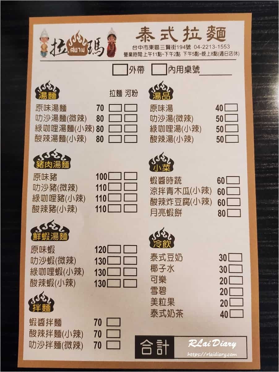 2020/03/03台中美食【台中 ※ 食】東區|拉瑪泰式拉麵平價泰式拉麵,隱藏巷弄的家庭式料理 分享這篇文章 地址:台中市東區三賢街194號電話:04-2213-1553連結:拉瑪泰式拉麵臉書營業時間:午餐 11:00 – 14:00 晚餐 17:00 – 20:00 星期日公休 這間拉瑪泰式拉麵是由朋友推薦的位置就在之前介紹的高麗屋附近【台中 – 食】高麗屋 韓式餐廳2 間都是異國料理的平價好選擇 位在三賢街的拉瑪是家庭式經營除了餐點外,老闆娘很親切也讓人印象深刻店內空間不大,用餐時間很容易客滿 …附近停車不容易建議騎車前往比較方便 拉瑪這兩年在南區也開了一間直營店改天可能去吃看看 追蹤我的 Instagram 追蹤我的 臉書粉絲團 拉瑪泰式拉麵 菜單 湯麵的部分可以選擇要搭配拉麵或是河粉主餐的價位最低只要 70 元真的是很親民 小菜 蝦醬時蔬 │ 60 元 高麗菜加入了蝦醬提味拌炒蝦醬的味道不會很重不會讓人覺得口味負擔太大 小菜 月亮蝦餅 │ 80 元 蝦餅的厚度偏薄但是真材實料幾乎每一口都能吃到蝦子外表炸到金黃酥脆搭配沾醬更好吃 豬肉湯麵 – 原味 │ 100 元 熬煮到乳白色的大骨湯味道甘甜濃純 … 好喝搭配叉燒肉、溏心蛋、丸子及青江菜等再加一片酥炸的餛飩皮點綴拉麵的麵條 Q 彈,吸附了大骨湯底的香味 鮮蝦湯麵 – 原味 │ 120 元 雖然叻沙口味也很多人推薦但我們比較偏愛原味鮮蝦湯麵基本上除了叉燒肉換成蝦子其他部分都相同也是不錯的選擇 平均花費與心得此次平均花費金額:NT 180 元 / 人停車空間不好找建議騎車前往會比較方便 拉瑪的主食訂價與口味表現 CP 值有一定水準小菜部分則是覺得份量稍微少了一點整體而言也是偶爾換口味不傷荷包的好選擇 延伸閱讀 – 周邊美食【台中 – 食】高麗屋 韓式餐廳【台中 – 食】新加坡風味小吃 【台中 – 食】拉瑪泰式拉麵地址:台中市東區三賢街194號電話:04-2213-1553連結:拉瑪泰式拉麵臉書營業時間:午餐 11:00 – 14:00 晚餐 17:00 – 20:00 星期日公休 分享這篇文章 運彩註冊教學 ATG試玩 咖啡推薦 咖啡指南 咖啡掛耳推薦 世界盃投注 標籤# 泰式# 蝦醬 上一 文章 【台中 ※ 食】北屯區|大胖兩個荷包蛋 下一 文章 【台中 ※ 食】北屯區|廚房早餐吧