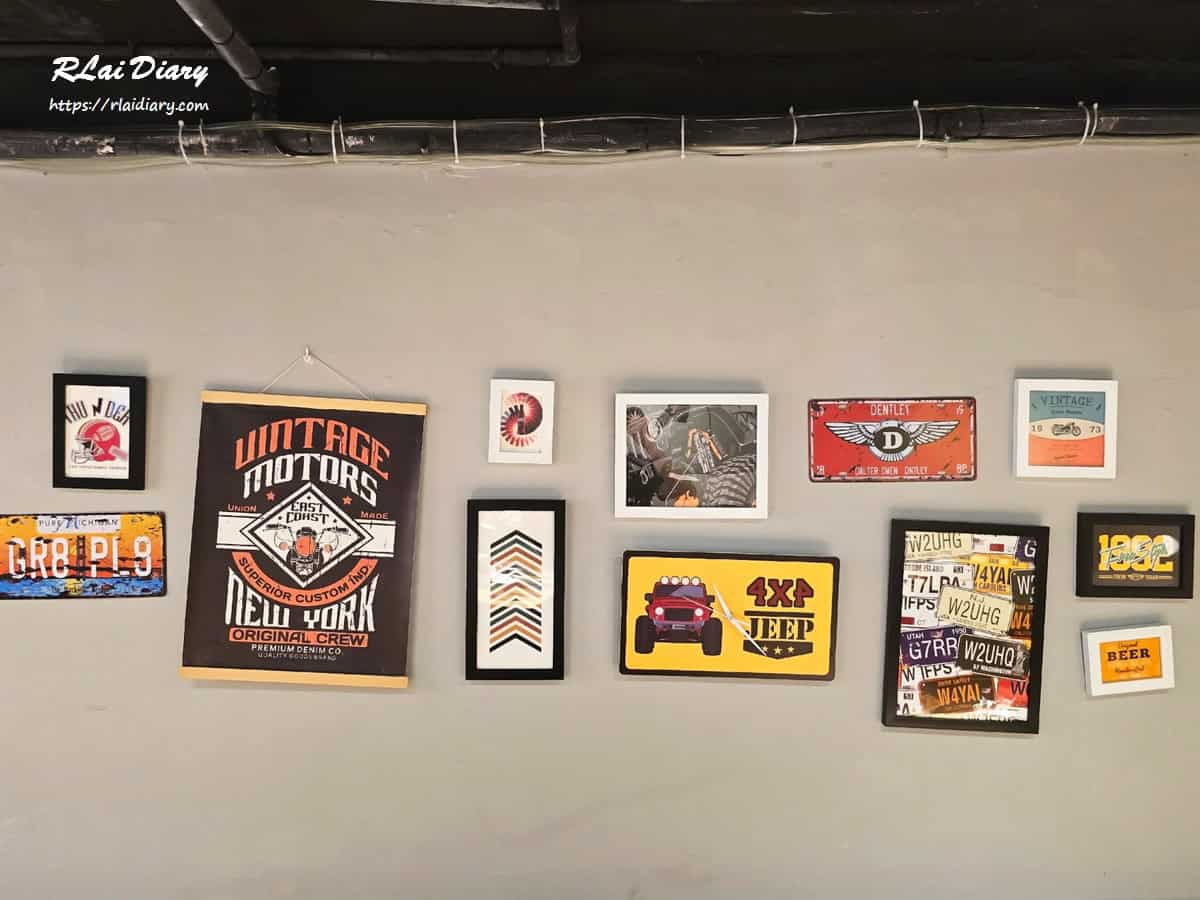牆面以復古老車牌、美式海報等組成