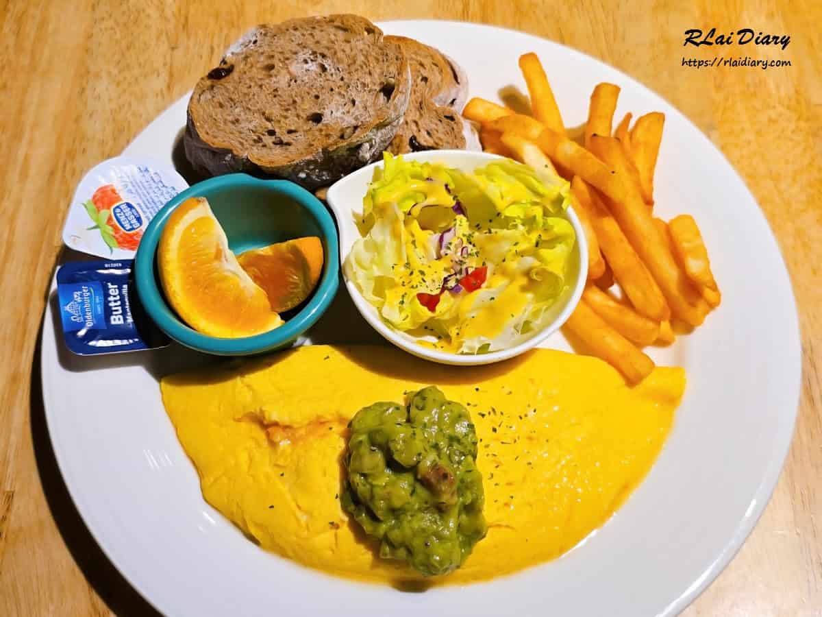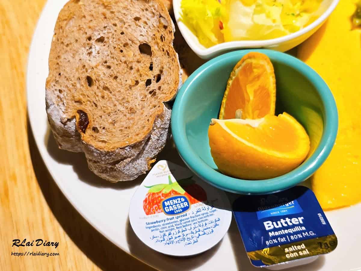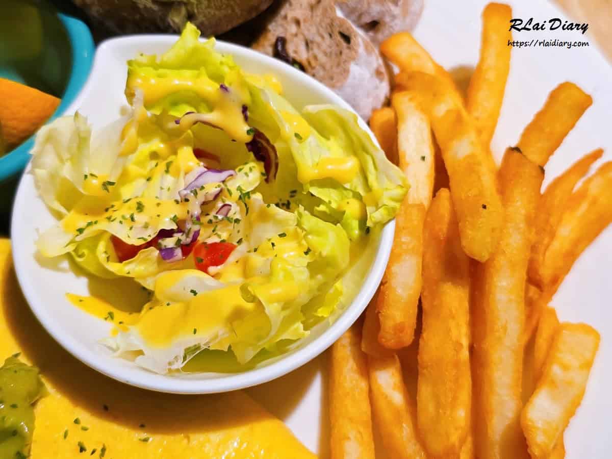 隨餐還搭配柳橙汁、脆薯、生菜與麵包