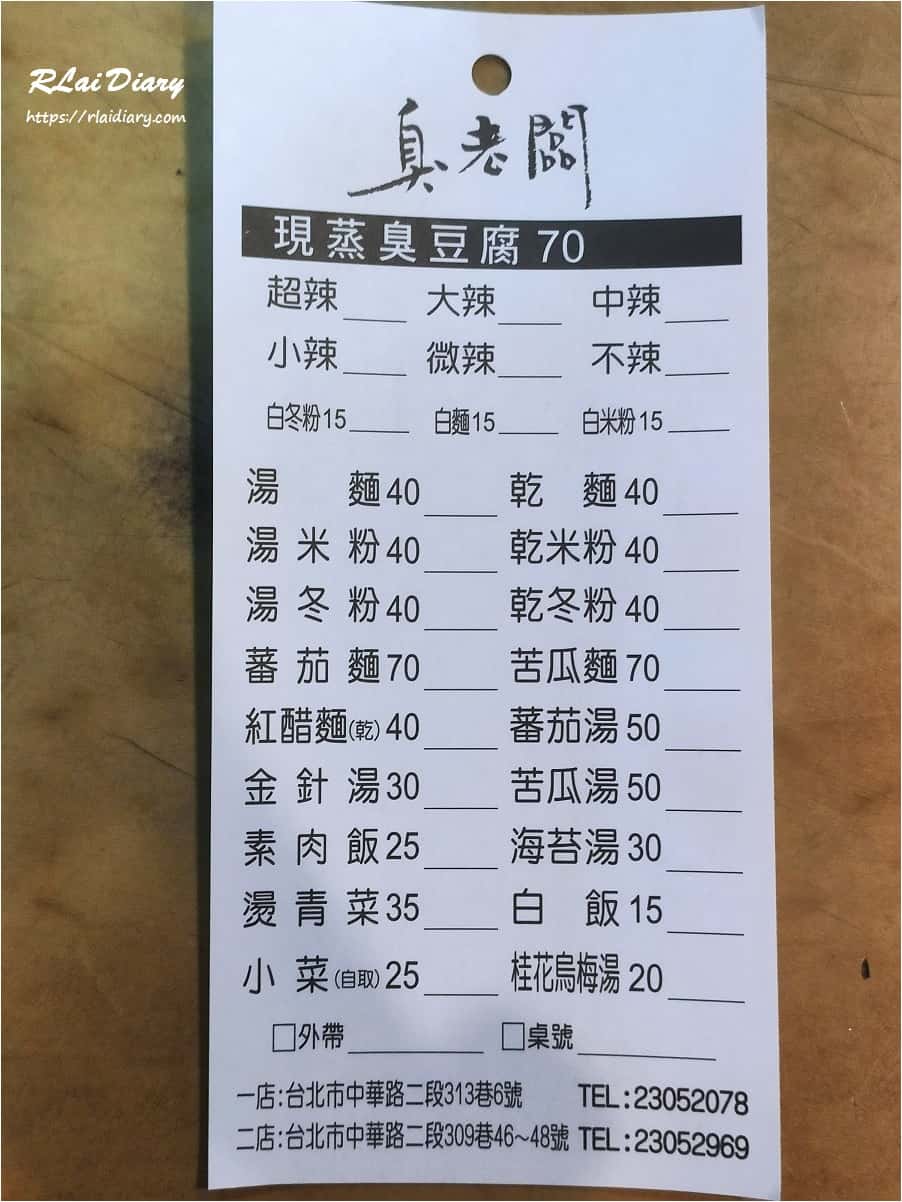 2020/03/22台北美食【台北 ※ 食】中正區|南機場夜市 臭老闆現蒸臭豆腐米其林必比登推薦,南機場夜市人氣小吃現蒸臭豆腐 分享這篇文章 地址:台北市中正區中華路二段313巷6號電話:02-2305-2078聯結:臭老闆現蒸臭豆腐臉書營業時間:上午 11:30 – 晚上 22:30 星期三公休 身為台中人的 RLai 雖然到台北來玩了很多次但是從沒逛過「南機場夜市」所以這次就先上網看看南機場有什麼特別的發現原來夜市裡有幾間榮獲米其林必比登推薦的美食臭老闆現蒸臭豆腐 – 很有個性的店名就決定是你了 !!! 臭老闆在南機場夜市裡面有2間店面當天前往的是本店2店和本店的距離不遠臭老闆現蒸臭豆腐 – 二店地址:台北市中正區中華路二段309巷46號 門口標示了臭老闆的料理是全素不含蛋和奶製品P.S 店內禁帶葷食 臭老闆本店的位置不多如果客滿的話不妨到附近的2店看看有沒有位置 店內一旁也有小菜可以自取選購 追蹤我的 Instagram 追蹤我的 臉書粉絲團 臭老闆現蒸臭豆腐 菜單 臭豆腐的辣度非常貼心的分為6級從不辣到超辣滿足各種對辣度接受度不同的人 現蒸臭豆腐 │ 70 元 2大塊以天然酵素發酵的非基改豆腐僅使用醋、醬油、香菇等健康的調味豆腐上有毛豆、香菇、薑絲以及提味九層塔當天點了小辣湯汁的部分溫和、不刺激 軟嫩的豆腐氣孔吸滿了湯汁綿密的口感令人讚不絕口 白冬粉 │ 15 元 冬粉上桌時是沒有調味的可以自己將臭豆腐的湯汁拌入吸飽湯汁後的冬粉非常好吃 蕃茄麵 │ 70 元 一碗麵裡面有不少青菜和蕃茄塊以新鮮番茄和蔬果熬煮湯頭清爽蕃茄味喝起來蠻特別的 燙青菜 │ 35 元 燙青菜上面還有加了不少的素肉燥 苦瓜湯 │ 50 元 苦瓜和鳳梨熬煮的湯頭苦瓜吃來不苦甘甜的滋味 平均花費與心得此次平均花費金額:NT 108 元 / 人先說缺點的部分除了價位感覺有點偏高外店內的空間也稍微擁擠了一點臭豆腐和其他餐點都有不錯的水準雖然是間全素食的小吃店但餐點是葷食者也都能接受的口味如果來到南機場夜市 不妨試一試 延伸閱讀 – 周邊美食【台北 – 食】南機場夜市 – 無名推車燒餅 延伸閱讀 – 推薦住宿【台北 – 宿】德立莊酒店 MIDTOWN 【台北 – 食】臭老闆現蒸臭豆腐地址:台北市中正區中華路二段313巷6號電話:02-2305-2078聯結:臭老闆現蒸臭豆腐臉書營業時間:上午 11:30 – 晚上 22:30 星期三公休 分享這篇文章 運彩出金 戰神賽特 咖啡豆挑選 冰萃秘訣 企業禮盒 球隊戰力觀察 標籤# 素食# 臭老闆# 臭豆腐 上一 文章 【台北 ※ 食】萬華區|小南鄭記台南碗粿 下一 文章 【台北 ※ 食】中正區|南機場夜市 無名推車燒餅